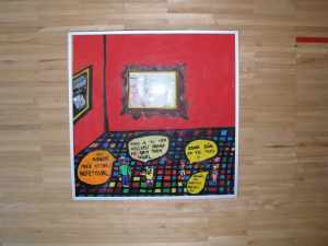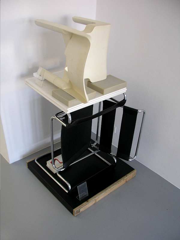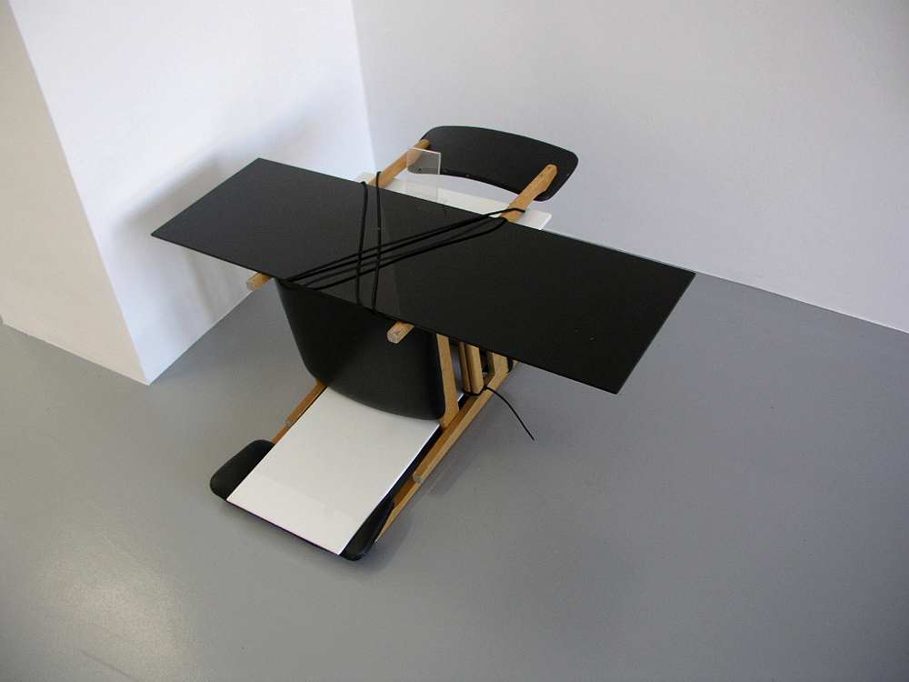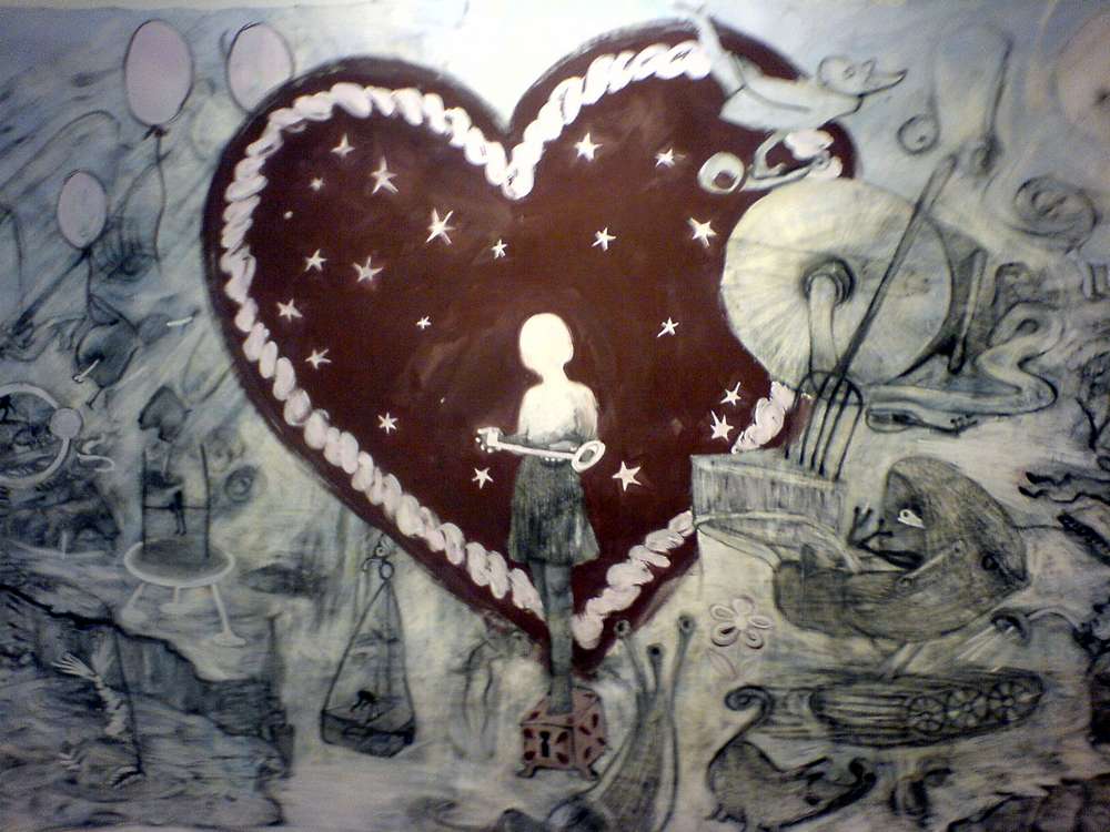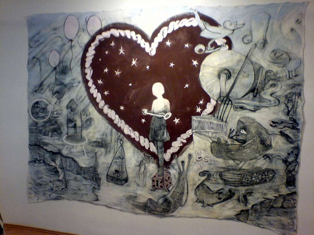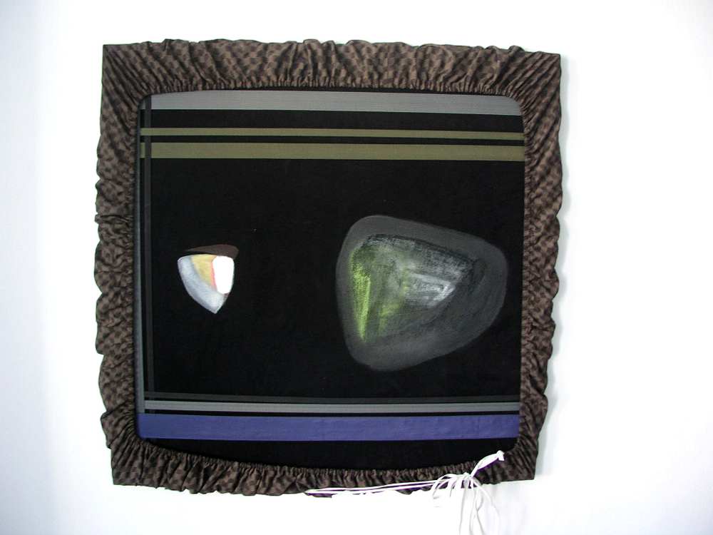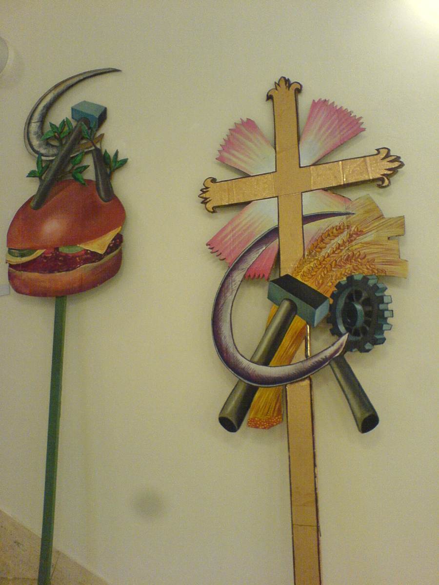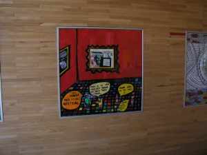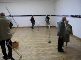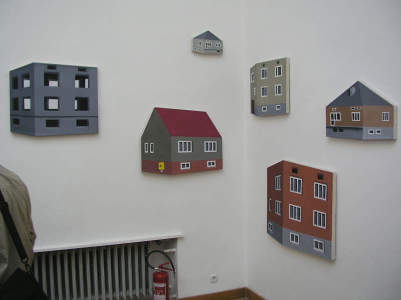 In the same time on the next side of the square, another southbohemian painter - Petr Písařík and his works, paintings and objects. He lives in Prague, but is former citizen of Trebon. What does "Domá ni" (title of his exhibition) mean? Why are the chairs bondaged? (It's worse for sitting then.) If the sticks - red hearts, are there on the place of description in the author's eyes, what should disagreeing visitor do? Quo Vadis Pietro? Although strong exhibition, isn't it?